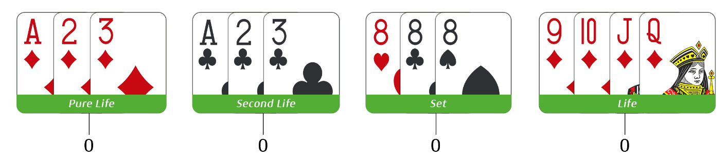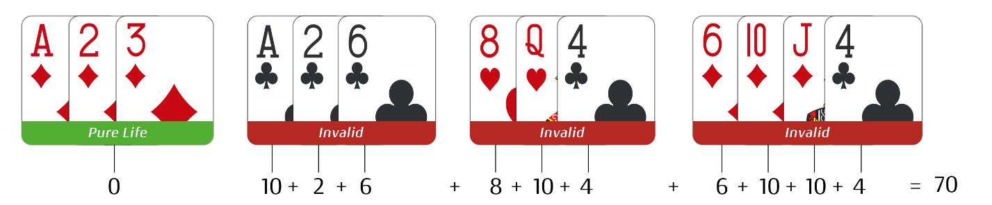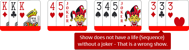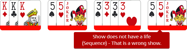 Valid Rummy Show requires players to arrange 13 cards in sequences (Life) and sets. A valid show consists of (1) Pure Life (2) Second Life (3) Cards left arranged as Life and/or Sets