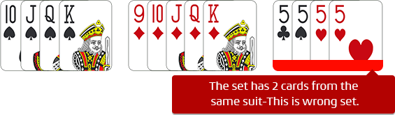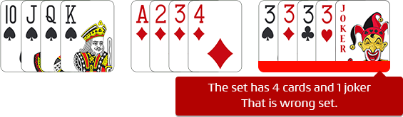 A set can have a maximum of 4 cards. Each has to be of a different suit and the same face value. A set cannot have more than 4 cards as shown below. In the example, the set has 3 cards and 2 jokers - that is a wrong set.